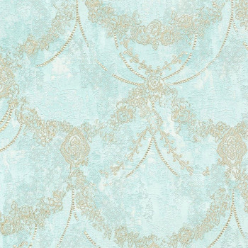 Šíře role 1,06m. Vliesová tapeta s vinylovým povrchem. Design tapety - jemně plastická, historická štuková omítka různých struktur v odstínech tyrkysové a perlové, bohatý zlatý zámecký vzor s patinou. Snadno zkombinujete se souvisejícími tapetami.