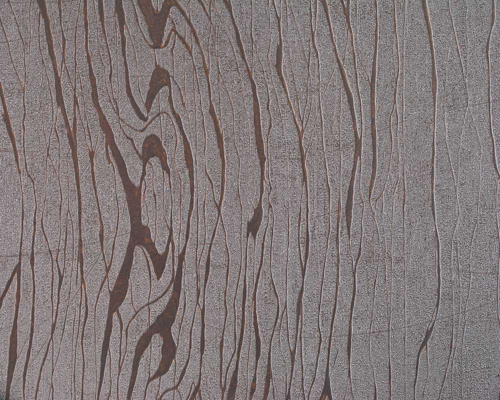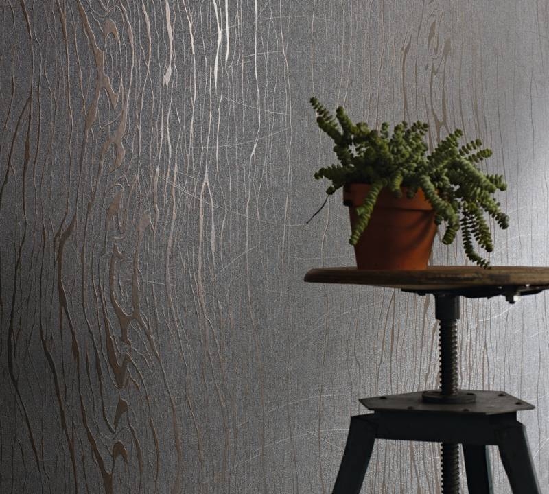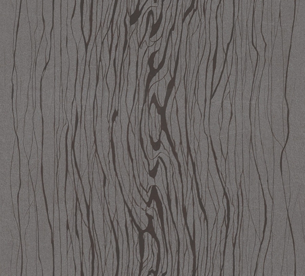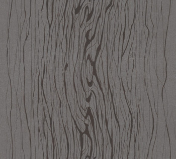 Efektní vzor struktury dřeva v tmavě hnědé a šedo-stříbrné barvě na vliesové tapetě.