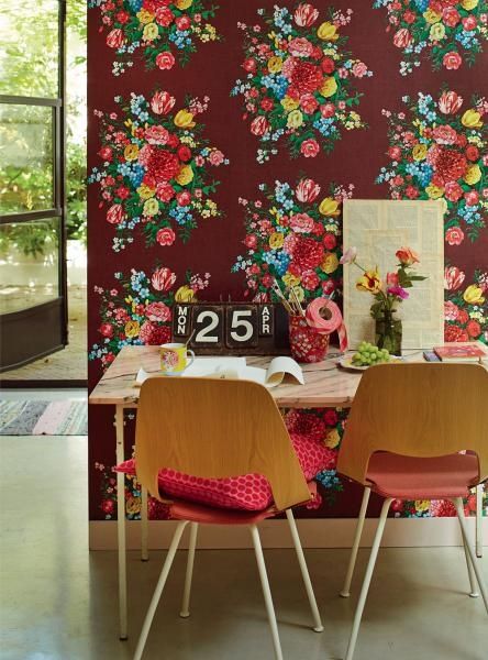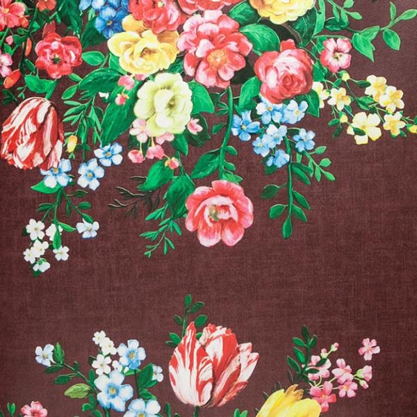 Pestré kytice květů na hnědo-vínové vliesové tapetě.
