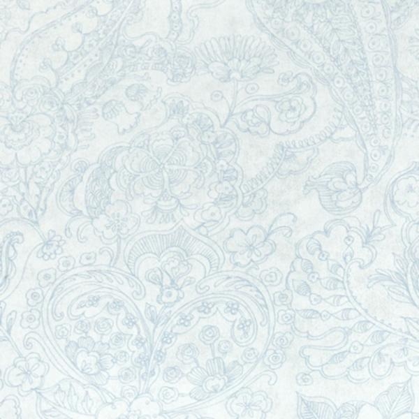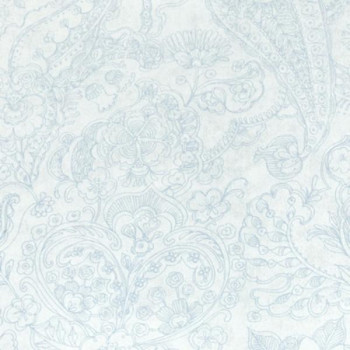 Květinové a ornamentální vzory v modro-bílé barvě na vliesové tapetě.