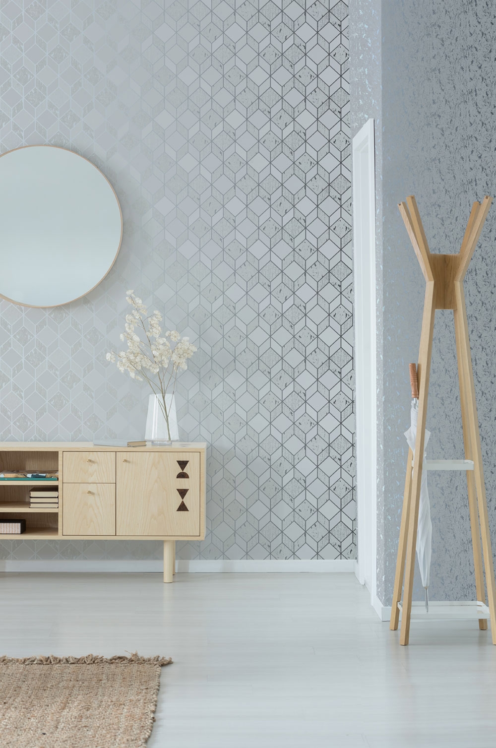 Metalické odlesky a výrazné textury dodají vašemu interiéru luxus a styl. Efektní střídání plastických, hladkých matných ploch a prolisů v odstínech šedé. Obrysy jsou hladké, metalické, stříbrné. Snadno zkombinujete se souvisejícími vzory.