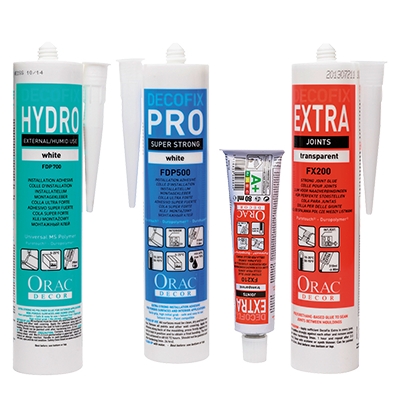 - Na profily vždy použijte lepidlo DecoFix Pro pro vnitřní prostory a na porézní povrchy použijte na spáry lepidlo DecoFix Extra. Lepidlo DecoFix Hydro se používá pro vlhké prostory, venkovní aplikace a neporézní povrchy.