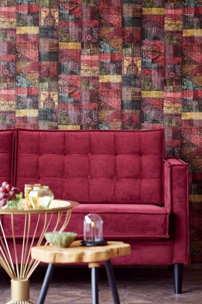 Pestrobarevný patchworkový vzor v zelené, červené a žluté barvě ve stylu prastarých arabských koberců.