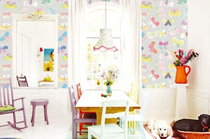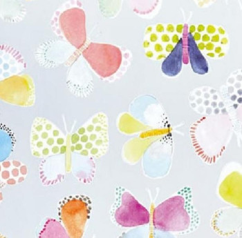 Pestrobarevní motýlci na šedé vliesové tapetě.