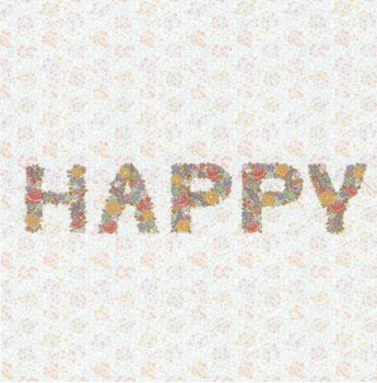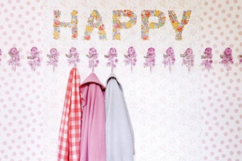 Květinový nápis HAPPY na květinové vliesové tapetě.