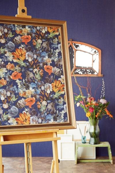 Jako z pláten starých mistrů. Pestrý květinový vzor - kosatce, tulipány, narcisy na tmavě modrém podkladu.