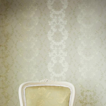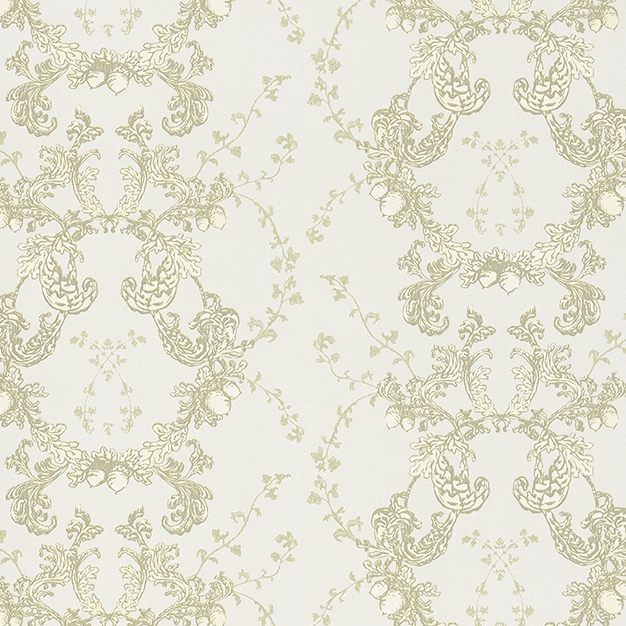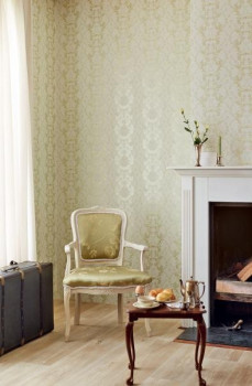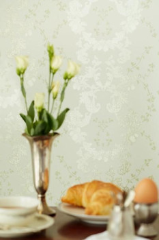 Bohatý ornamentální vzor v zelené barvě na vliesové tapetě.