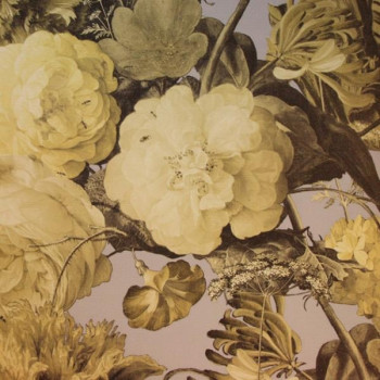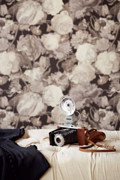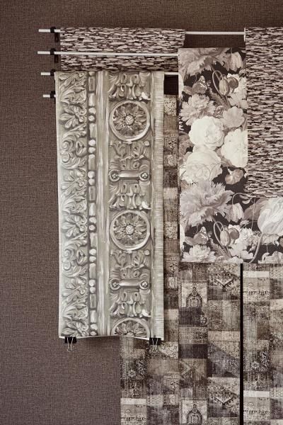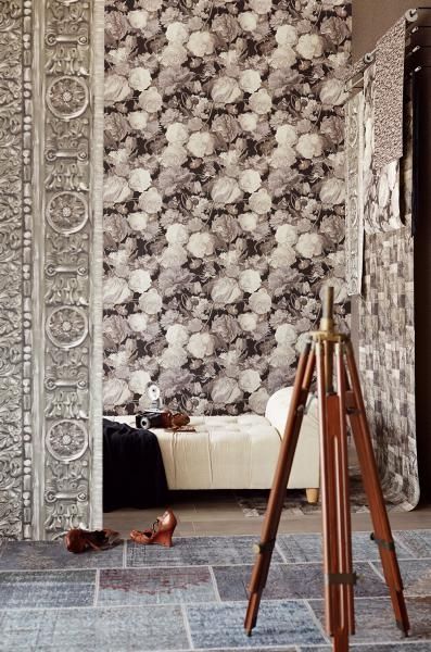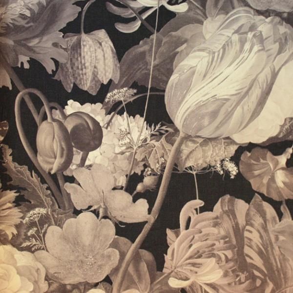 Jako z pláten starých mistrů. Květinový vzor v šedé a béžové barvě na černém podkladu.