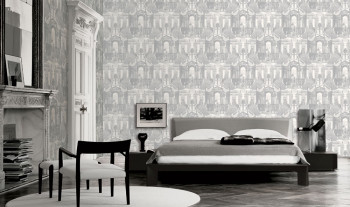 Vliesová, hladká tapeta. Stříbrný tisk na světle šedém podkladu.