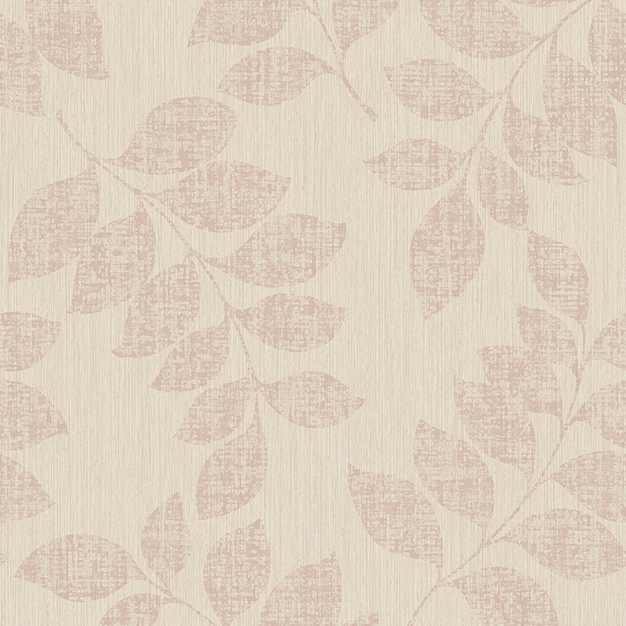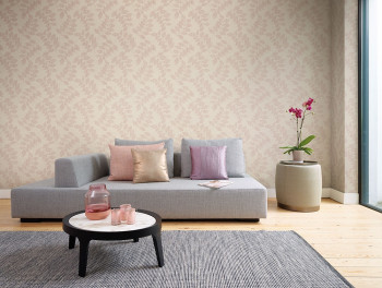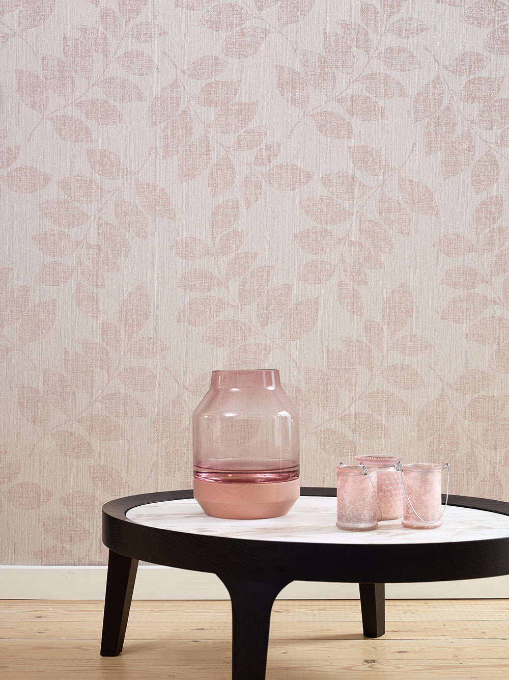 Rostlinné motivy dodají interiéru útulnost a styl. Vzor lístků na růžové metalické tapetě.