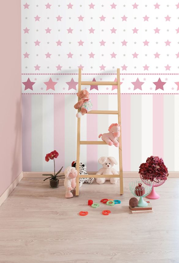 Dětská pruhovaná bílo-šedo-růžová papírová tapeta na zeď.