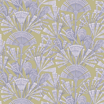 Přírodní motivy v modro-fialových barvách na zelené vliesové tapetě.