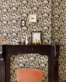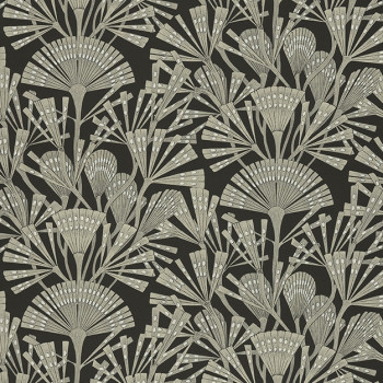 Stříbřité přírodní motivy na černé vliesové tapetě.