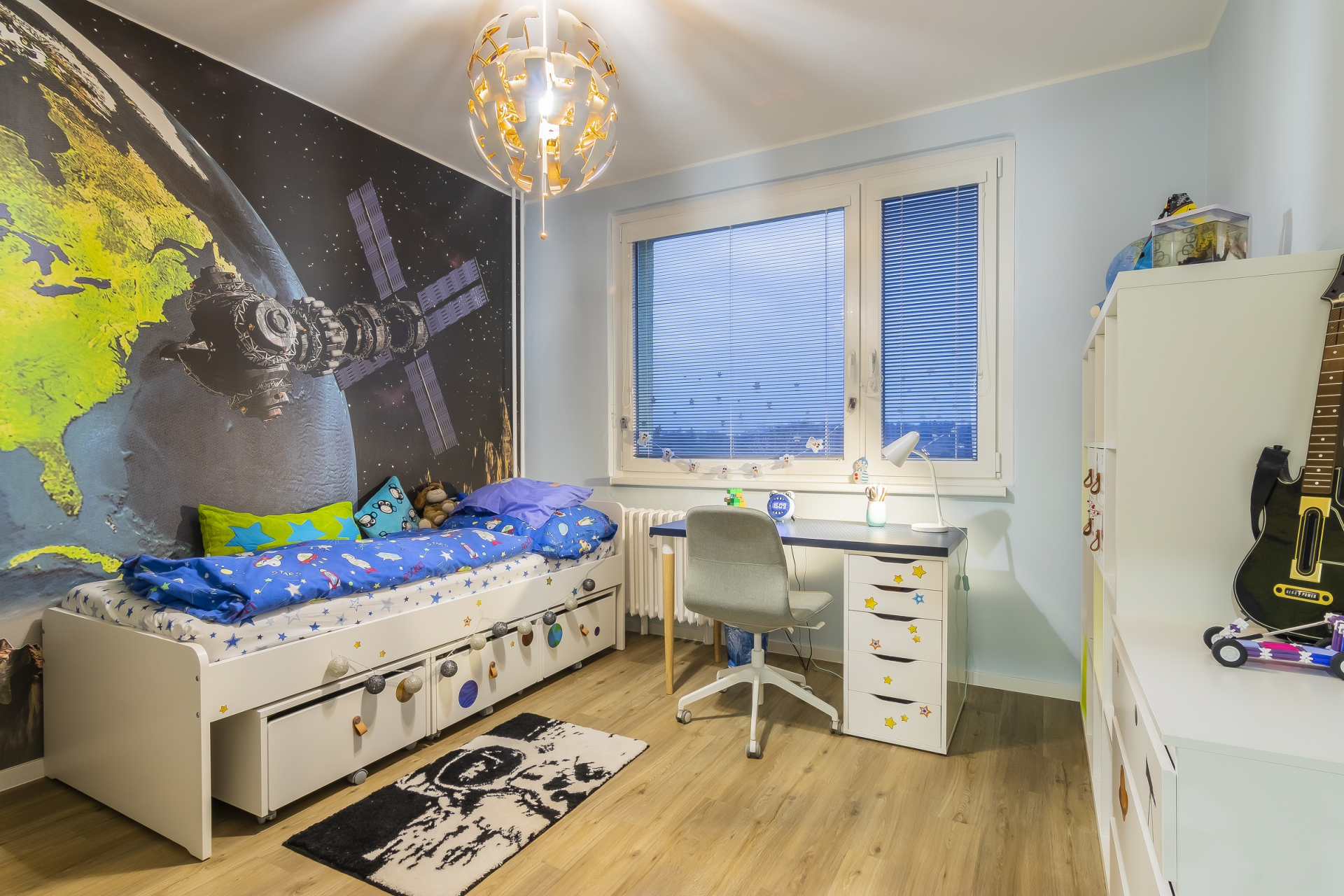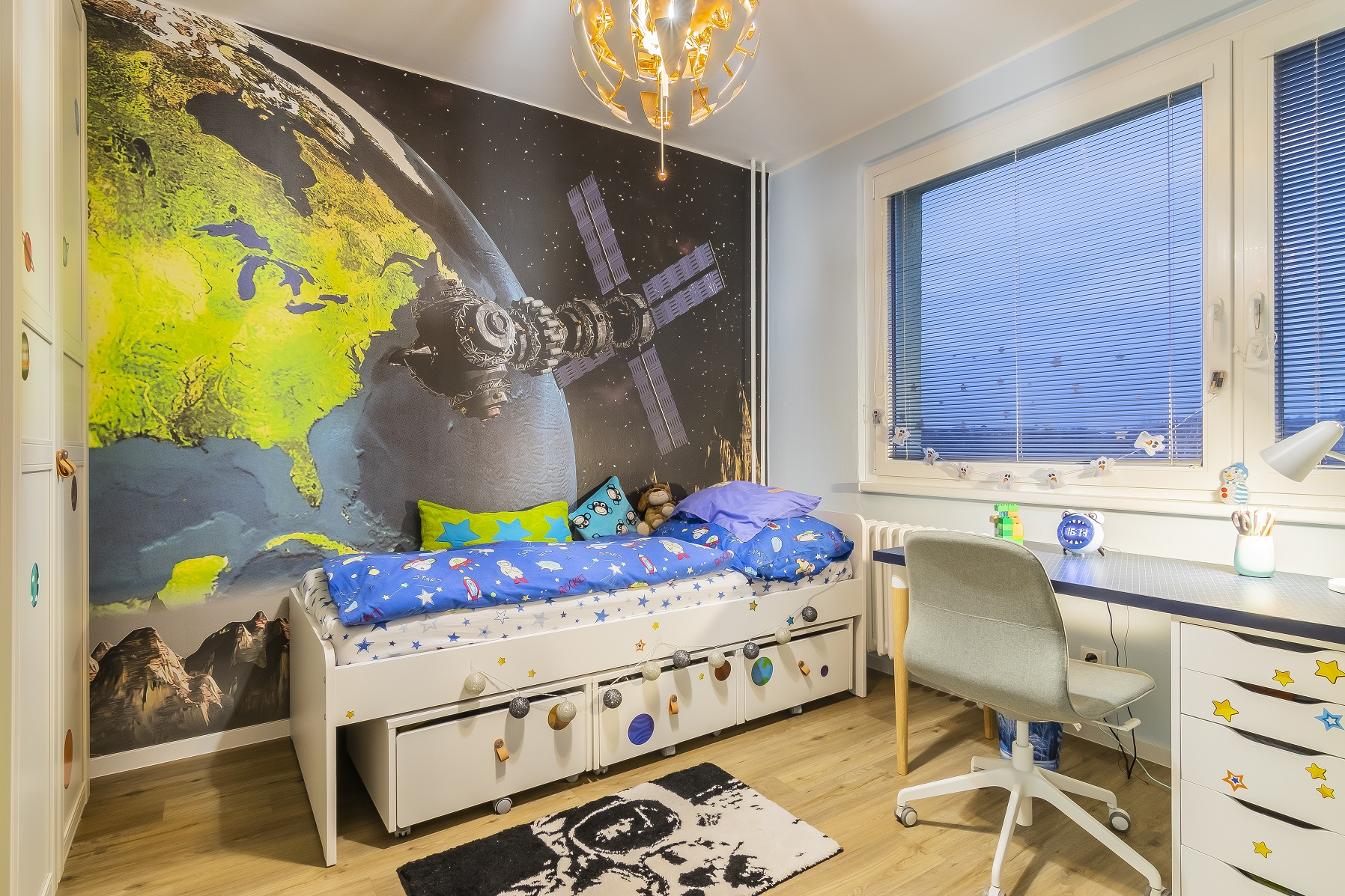 Podívejte se na krásnou realizaci pokoje pro malého chlapce, jehož vášní je vesmír. Hlavní dominantu pokojíčku tvoří vliesová obrazová tapeta FTNS 2443, která má rozměry 3,6 x 2,7m.