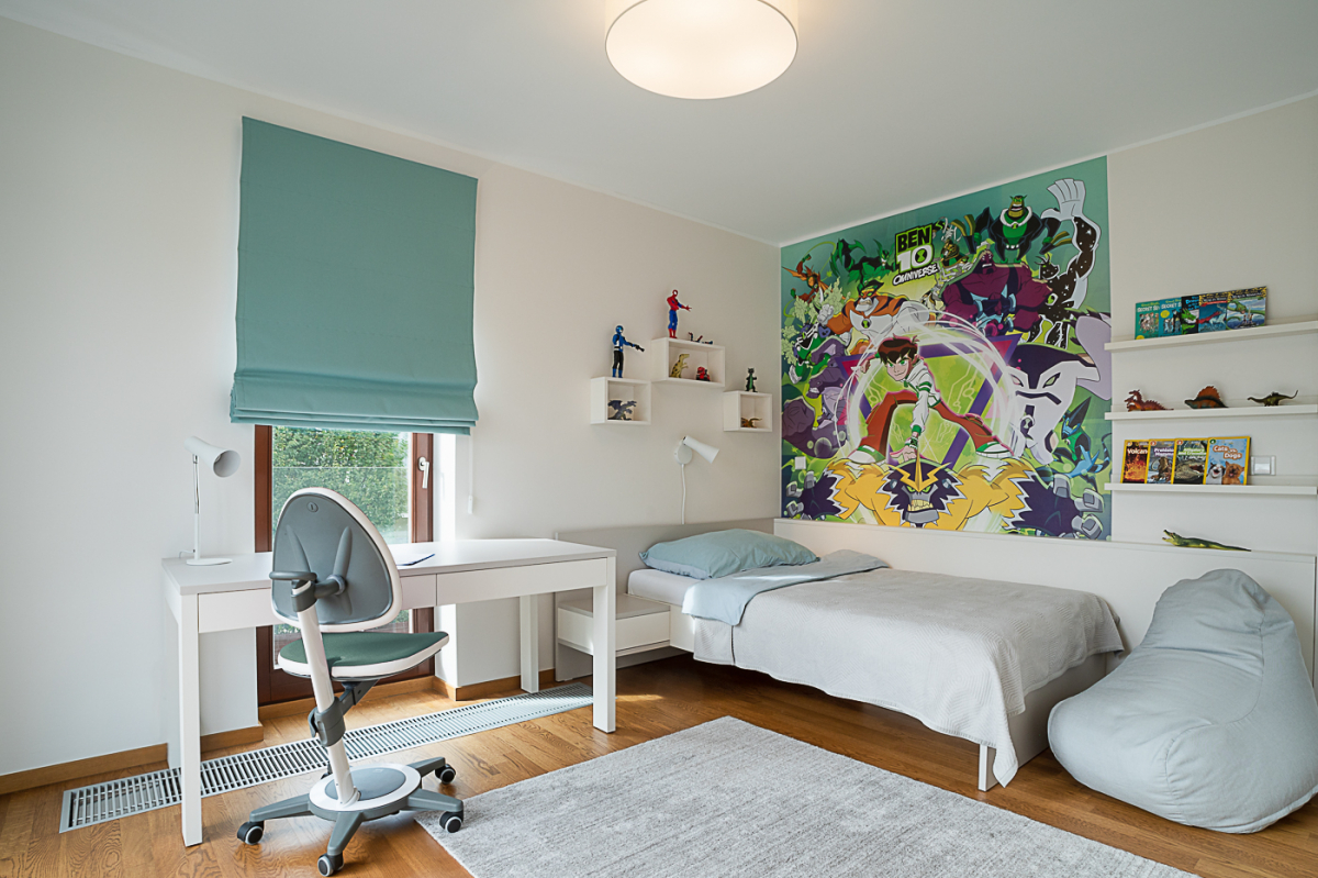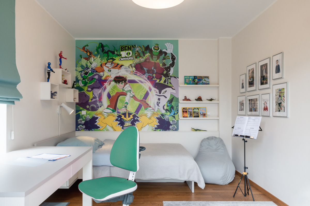 Šlo zde především o to, aby pokoj odrážel momentální zájmy chlapce, ale zároveň rostl s ním. Nyní klučina miluje postavu Bena 10 z amerického sci-fi seriálu, takže naše obrazová tapeta č. 42841 byla jasnou volbou. Za několik let, až klučina bude mít jiné zájmy, mohou rodiče tapetu jednoduše vyměnit za jinou.