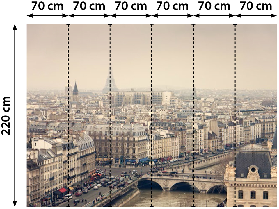 Tapetu tiskneme v pruzích šíře 70, 100 nebo 125cm (podle vybraného materiálu) x výška místnosti a následně se složí obraz.