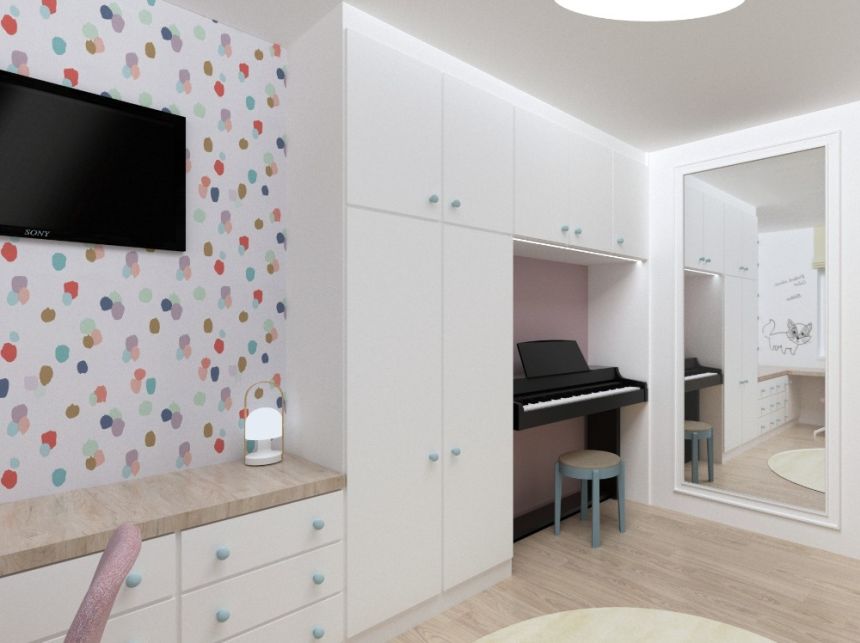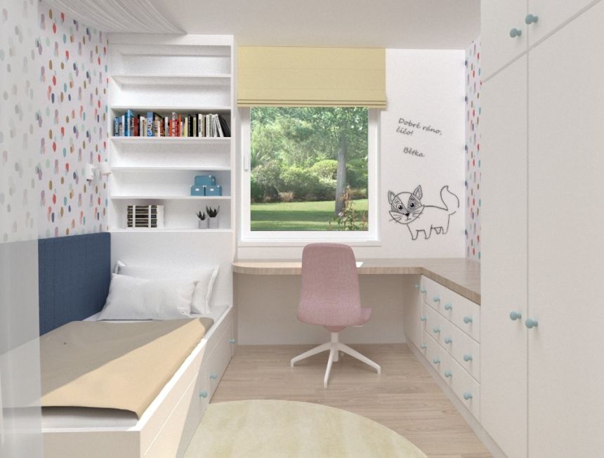 Dětský pokoj je sladěn do jemných barev zvolených podle výrazné barevné tapety, která hraje v místnosti hlavní roli.
