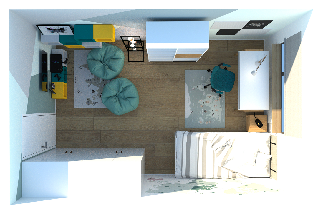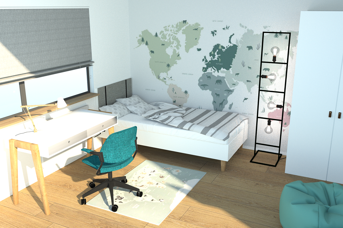 Inspirujte se vizualizací dětského pokojíčku pro malého školáka s obrazovou tapetou mapy světa č. 158929. Tapeta nejen rozveselí prostor, ale také malého školáka něčemu naučí.